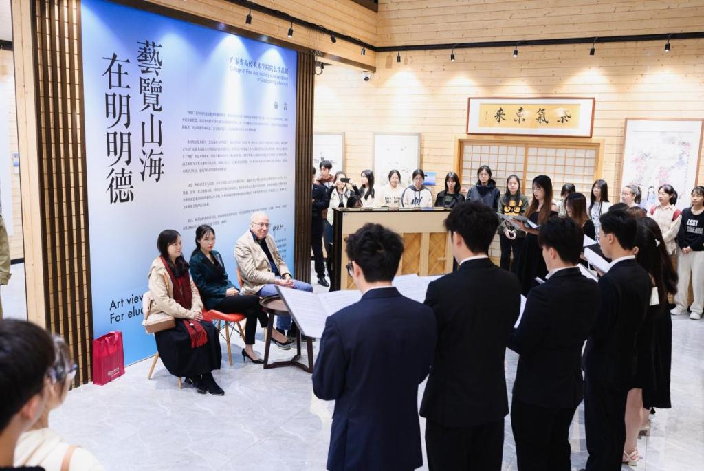 在刘婉莉(霖霖)副董事长的指导下,音乐系、校团委艺术团学子合唱了《斯卡布罗集市》《Innocence》等三首经典歌曲。优美悠扬的旋律,如同一股清澈、温润的泉流,轻柔地流淌进在场的师生的心田,把大家带进这场集视觉与听觉的盛宴。动听的歌曲和精彩的表演,让在场师生纷纷发出赞叹,表示享受了一场视听盛宴。