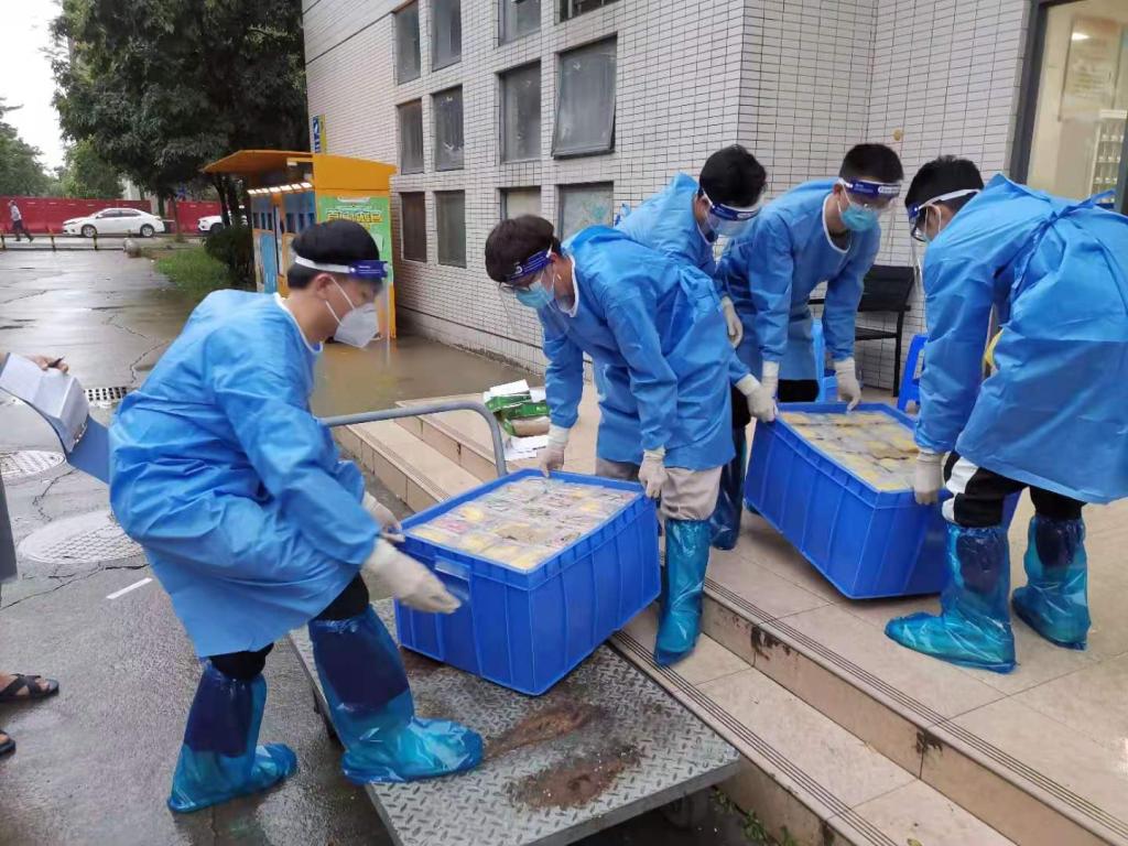 他们组织人员负责员工的一日三餐,在没有电梯的宿舍逐层爬楼为员工送餐。在东莞酷热的天气之下,不一会儿防护服里面的工作人员就全身湿透。