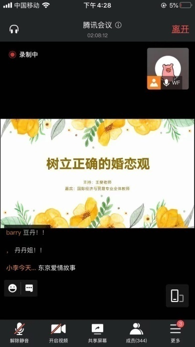 6月28日下午,国贸专业筹划的“爱情故事分享会”活动于众人期盼中在腾讯课堂开展。此次分享会由王斐副教授主持,吸引了近400人在线观看,取得了良好的反馈效果,为我们抗疫工作带来了轻松一刻。