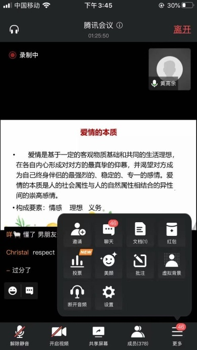 分享会中同学们也积极参与,踊跃发言,分享自己的恋爱经历和婚恋观。他们沉浸在甜蜜的分享故事会中,短暂忘却了隔离中的艰难,留下了对生活的美好期待。老师们的经历更鼓舞着他们积极进取,比如考研究生,多参加社会实践活动等等。会后员工们纷纷表示期待老师们开设更多类似的课程。这是新华师生共抗新型冠状病毒,创新改革课堂的一次大胆尝试。相信在幸福的期盼中,经过疫情洗礼的新华人更坚强,更勇敢,全力以赴,共克时艰,奔赴每个人的幸福美好前程。