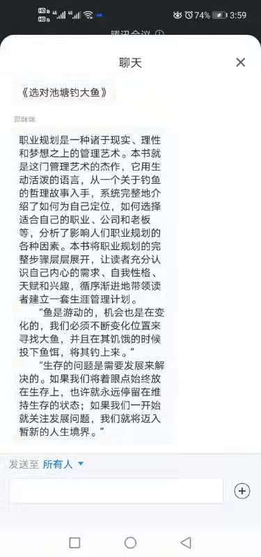 方建国副经理以他丰富的人生经验和我们讲述了关于选职业的要点。他说选职业要结合兴趣,关注自我擅长的领域,同时要心怀志向,树立目标并做好坚持、锻炼自我。同时他也推荐了雷恩.吉尔森的《选对池塘钓大鱼》,书中通过钓鱼的哲理故事入手为我们讲述了生存与发展的宏大命题。