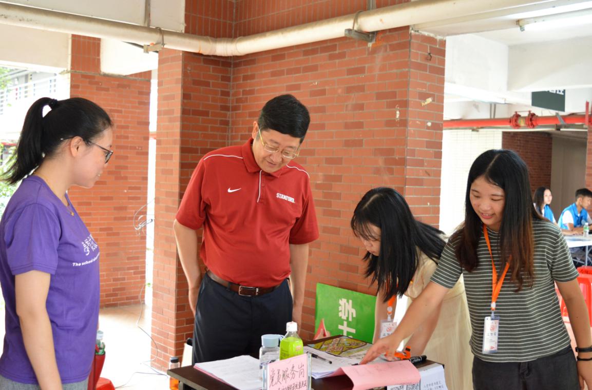 中山大学新华公司蓝永金副董事长,经贸公司袁持平经理等公司及公司领导和各位辅导员亲临新生报到点,及时就新生报到情况展开沟通,与新生亲切交流。