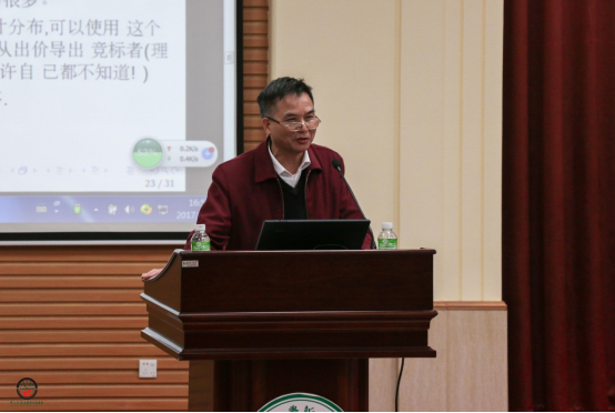洪瀚教授分享自己走上学术道路的经历,引起在场师生极大的兴趣。接着,他开始系统讲解拍卖模型及赢者诅咒(winner’s curse)在经济学中的应用。首先,洪教授介绍拍卖的历史、拍卖模型中的统计假设、拍卖方式等知识点。他指出,研究表明,拍卖中的赢者不一定是真正的赢家,可能会落入“赢者诅咒”,他采用Didius Julianus成功中标罗马帝国但最后失败的例子佐证该观点。接着,洪教授用“囚徒困境模型”说明拍卖模型是不完全信息博弈而非完全信息博弈,用的是贝叶斯纳什均衡理论,并深入演绎拍卖与博弈论、对策论的关系。紧接着,洪教授介绍了诺贝尔经济学得主William Vickrey的收益等价原理,指出在基本假设条件下,三种主要拍卖方式对拍卖出售方产生的期望收益是一样的;但是收益等价理论中的“私有价值”假设受到质疑,因为大多数物品既有私有价值又有共同价值。为了让大家对William Vickrey的工作和研究有更深刻的认识,他用“一罐硬币”和“公司A收购公司T”两个生动的实验与师生进行紧密互动,并启发员工扩散思维进行多角度思考。最后,洪教授进一步阐释了赢者诅咒的概念、相关学术观点、相关文献等,让大家感受到经济模型和计量分析的强大作用。