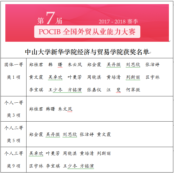 2017年11月28日,历时20天的全国老员工外贸从业能力大赛(简称:POCIB大赛)秋季赛终于落下了帷幕。由公司2015级国际经济与贸易专业的20名同学组成的中山大学新华公司参赛队伍一举斩获本次比赛的团体一等奖以及17项个人奖项,其中3人获得个人一等奖,5人获得个人二等奖,9人获得个人三等奖。